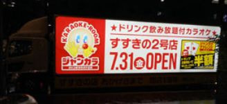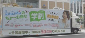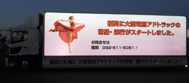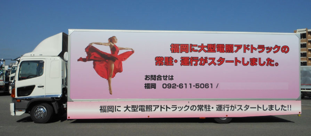アドトラックは繁華街を走行しながら、多くの人の目に触れさせることができる広告媒体です。内照式ですので夜間はさらに注目度がアップします。内蔵スピーカーで音楽・サウンドロゴや音声も流せます。弊社所有のADトラックを福岡市に常駐していますので、関東や関西からトラックを出張させることなく低価格で九州・中国地方でのADトラック運行が実施出来ます。